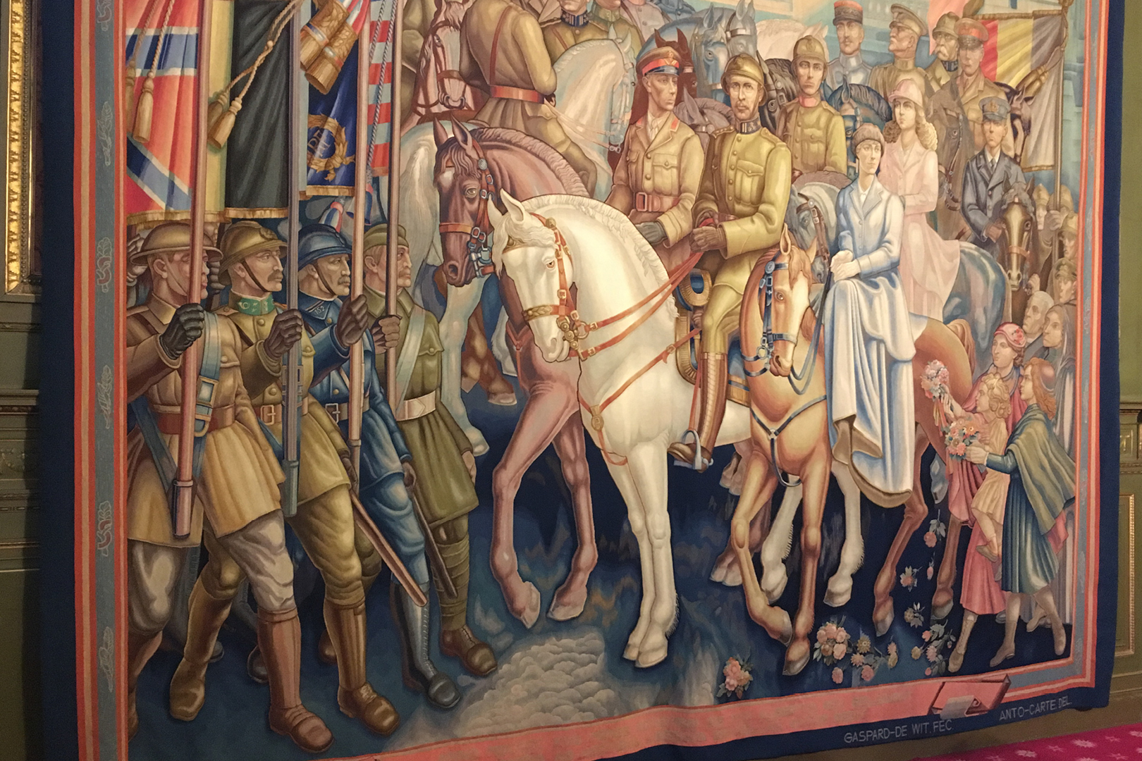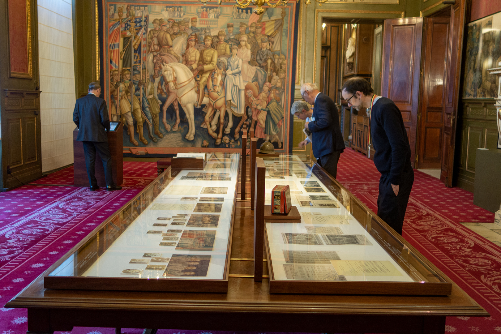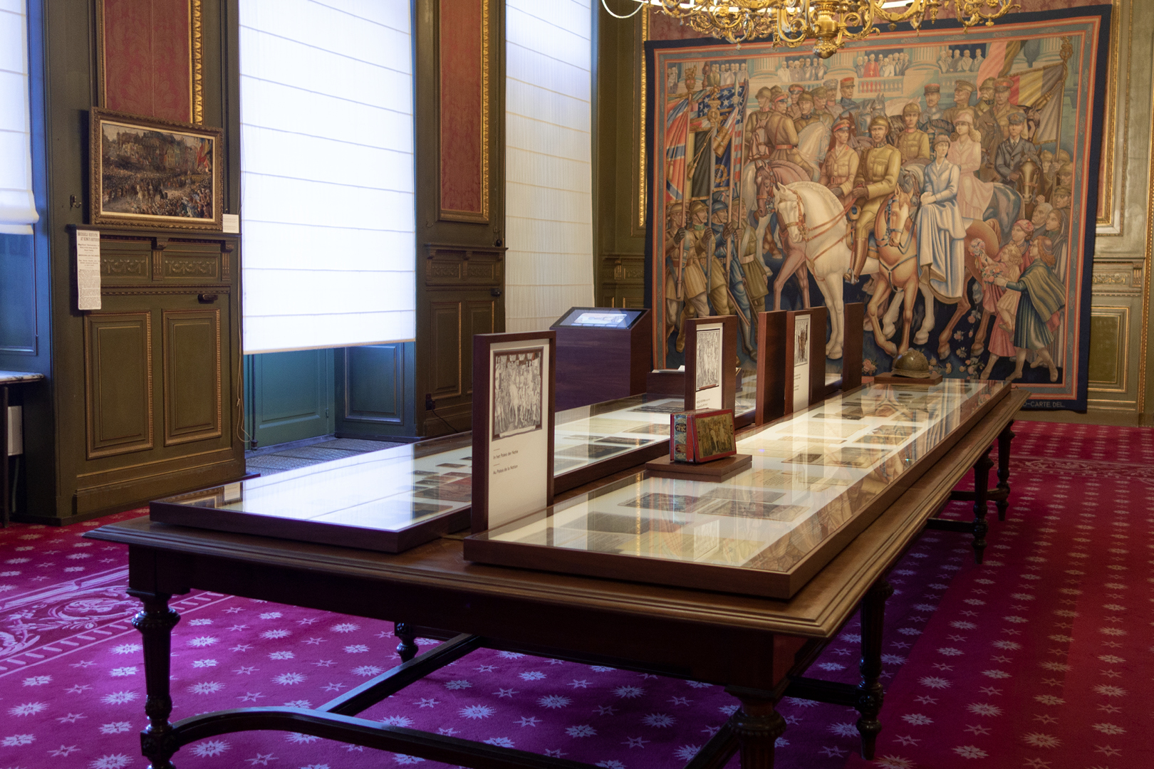 The exhibition is built around the tapestry commissioned to Anto Carte in 1934 Le retour victorieux du Roi Albert à la tête de ses troupes à Bruxelles le 22 novembre 1918 ("King Albert returns triumphant at the head of his troops, Brussels, 22 November 1918") located in the Reading Room of the Senate to commemorate the entry of Albert I into Brussels liberated a hundred years ago, on 22 November 1918.